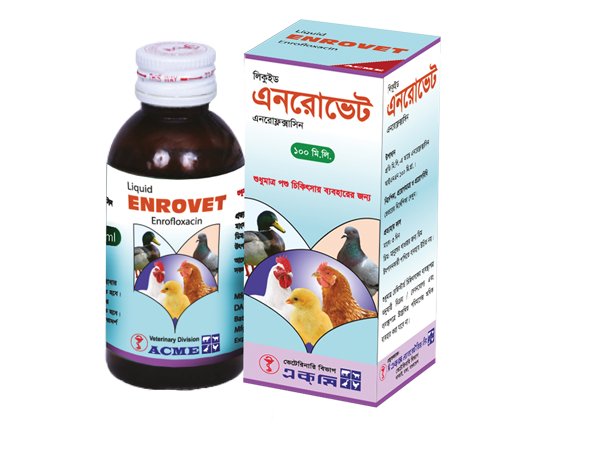 Enrovet is indicated For the prevention & treatment of respiratory and digestive tract infections caused by Mycoplasma, E. coli, Pasteurella, Salmonella etc. such as Mycoplasmosis, colibacillosis, Fowl Cholera, Salmonellasis etc. It is also indicated for the prevention & treatment of secondary bacterials infections followed by viral infections such as Ranikhet, Gumboro etc.