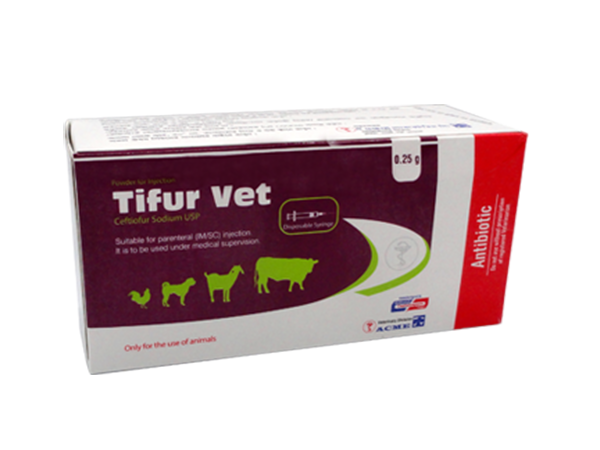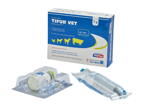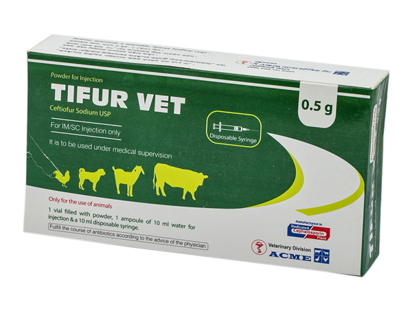 Tifur Vet is indicated for the treatment of bovine respiratory diseases (shipping fever, pneumonia) associated with Mannheimia haemolytica, Pasteurella multocida, Histophilus somni and acute bovine interdigital necrobacillosis (foot rot, pododermatitis) associated with Fusobacterium necrophorum and Bacteroides melaninogenicus.