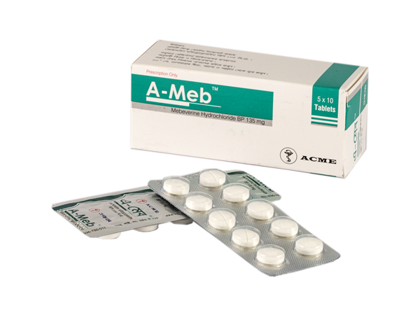 A-Meb (Mebeverine) is indicated for the symptomatic relief of GI spasm and abdominal pain & bloating in irritable bowel syndrome. Other conditions include: Chronic irritable colon, spastic constipation, Mucous colitis, Colicky abdominal pain and cramps, Persistent non-specific diarrhoea.