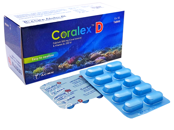 Coralex D Tablet: Each film-coated tablet contains Calcium (from Coral source) 500 mg and Vitamin D3 (as Cholecalciferol) BP 200 IU.