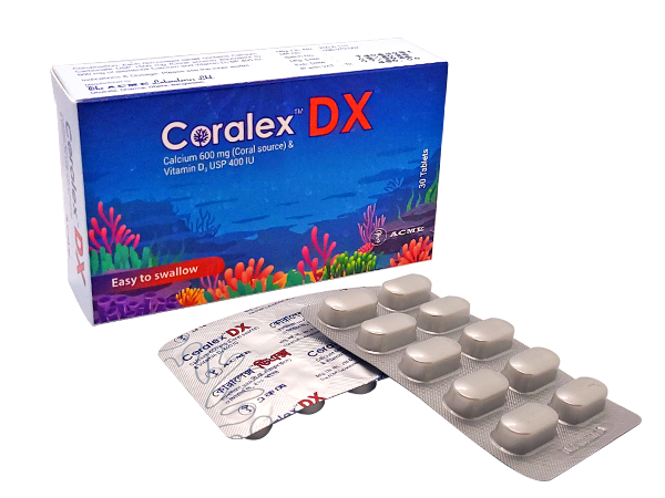 Coralex DX Tablet: Each film-coated tablet contains Calcium (from Coral source) 600 mg and Vitamin D3 (as Cholecalciferol) BP 400 IU.