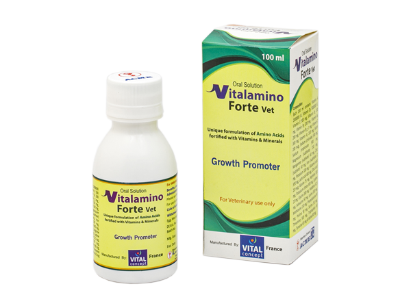 Vitalamino\\\\r\\\\nForte Vet 100 ml Oral Solution: Each\\\\r\\\\n100 ml contains Vitamin A 2000000 IU, Vitamin D3 500000 IU, Vitamin\\\\r\\\\nE 500 mg, Vitamin B1 100 mg, Vitamin B2 200 mg, Vitamin B6\\\\r\\\\n200 mg, Vitamin B12 1 mg, Vitamin C 300 mg, Vitamin K3\\\\r\\\\n100 mg, Biotin 200 mcg, Sodium (chloride) 500 mg, Sodium propionate 500 mg,\\\\r\\\\nMagnesium (sulphate) 150 mg, Manganese (sulphate) 60 mg, Zinc (sulphate) 60 mg,\\\\r\\\\nIron (sulphate) 2 mg, Potassium 100 mg, Glutamic acid 350 mg, Lactic acid 400\\\\r\\\\nmg, Citric acid 20 mcg, Alanine 75 mg, Arginine 100 mg, Potassium citrate 300\\\\r\\\\nmg, Cystine 20 mg, Glycine 300 mg, Histidine 52.5 mg, Isoleucine 50 mg, Lysine\\\\r\\\\n500 mg, Methionine 150 mg, Phenylalanine 90 mg, Proline 90 mg, Serine 90 mg,\\\\r\\\\nThreonine 300 mg, Tryptophan 60 mg, Tyrosine 65 mg & Valine 80 mg.